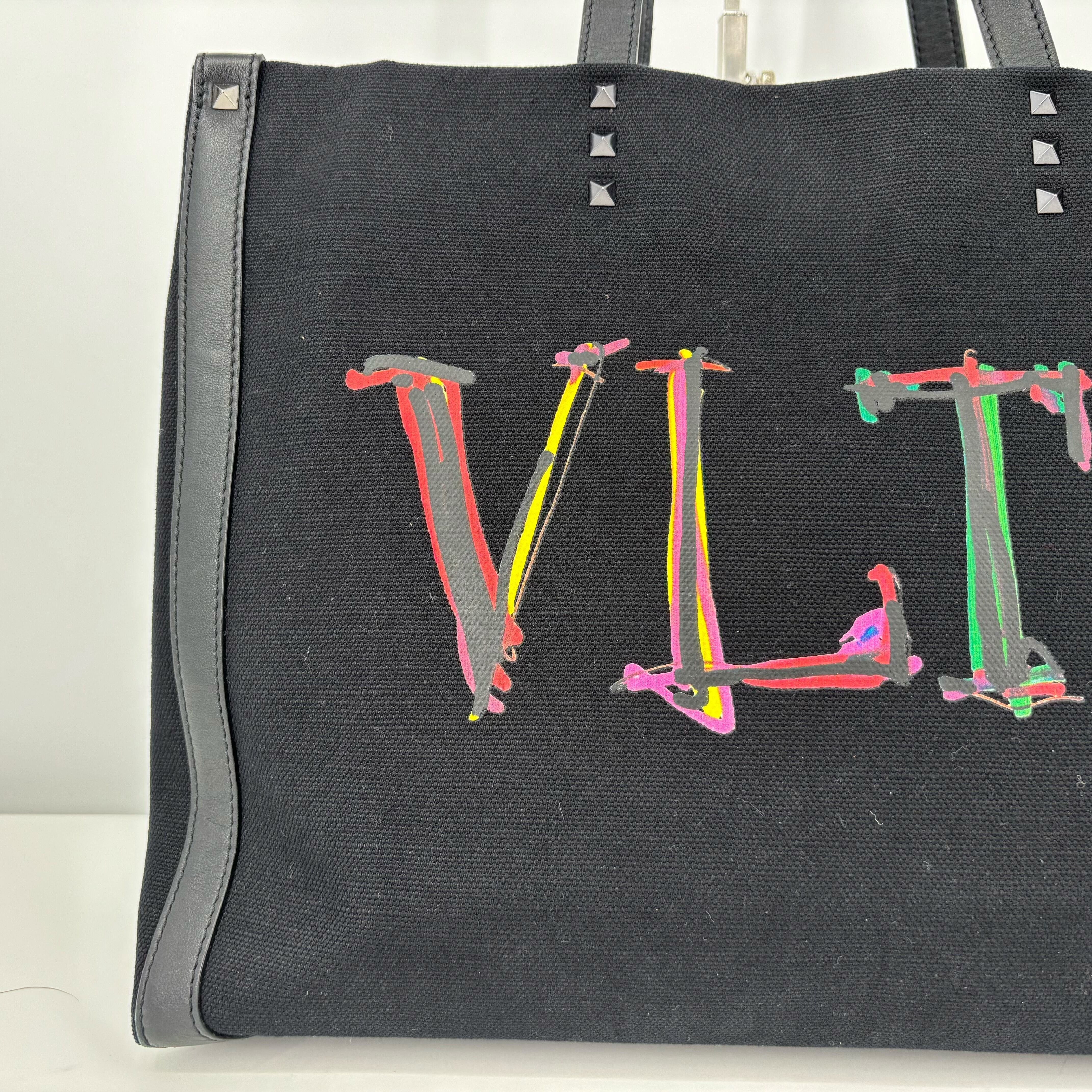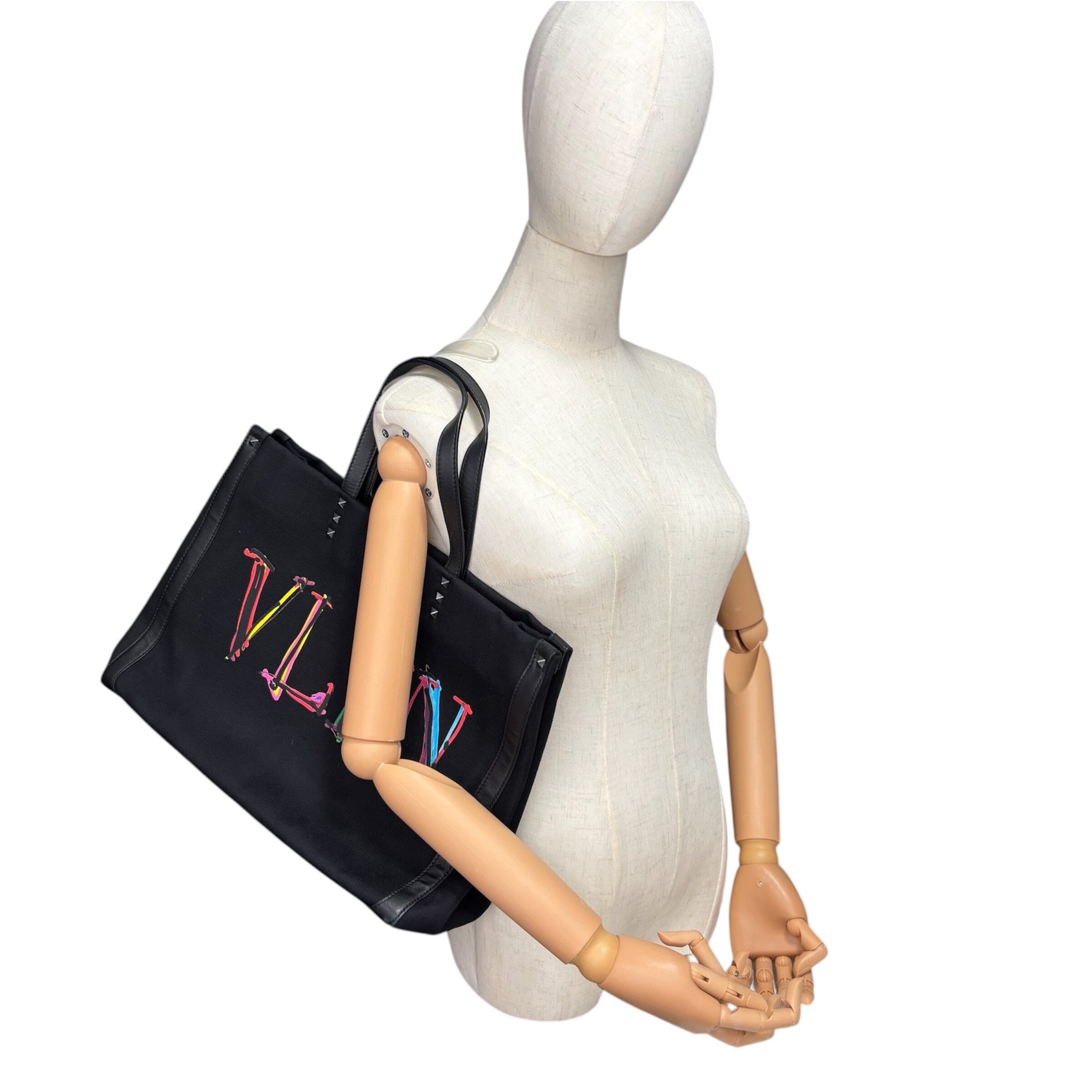 Valentino Garavani Tote Bag Black Canvas Graph VLTN Neon Rockstuds Authentic From Japan